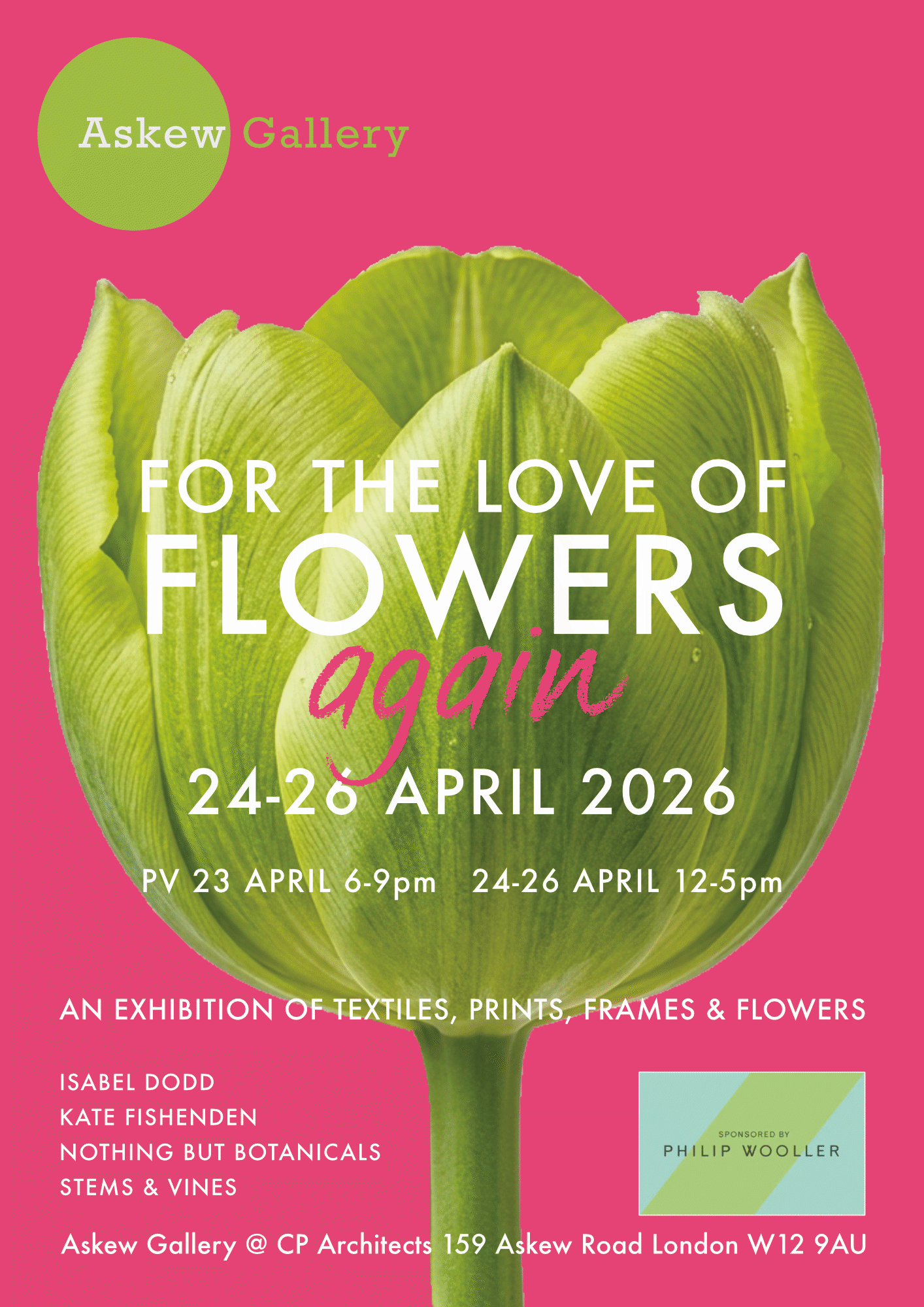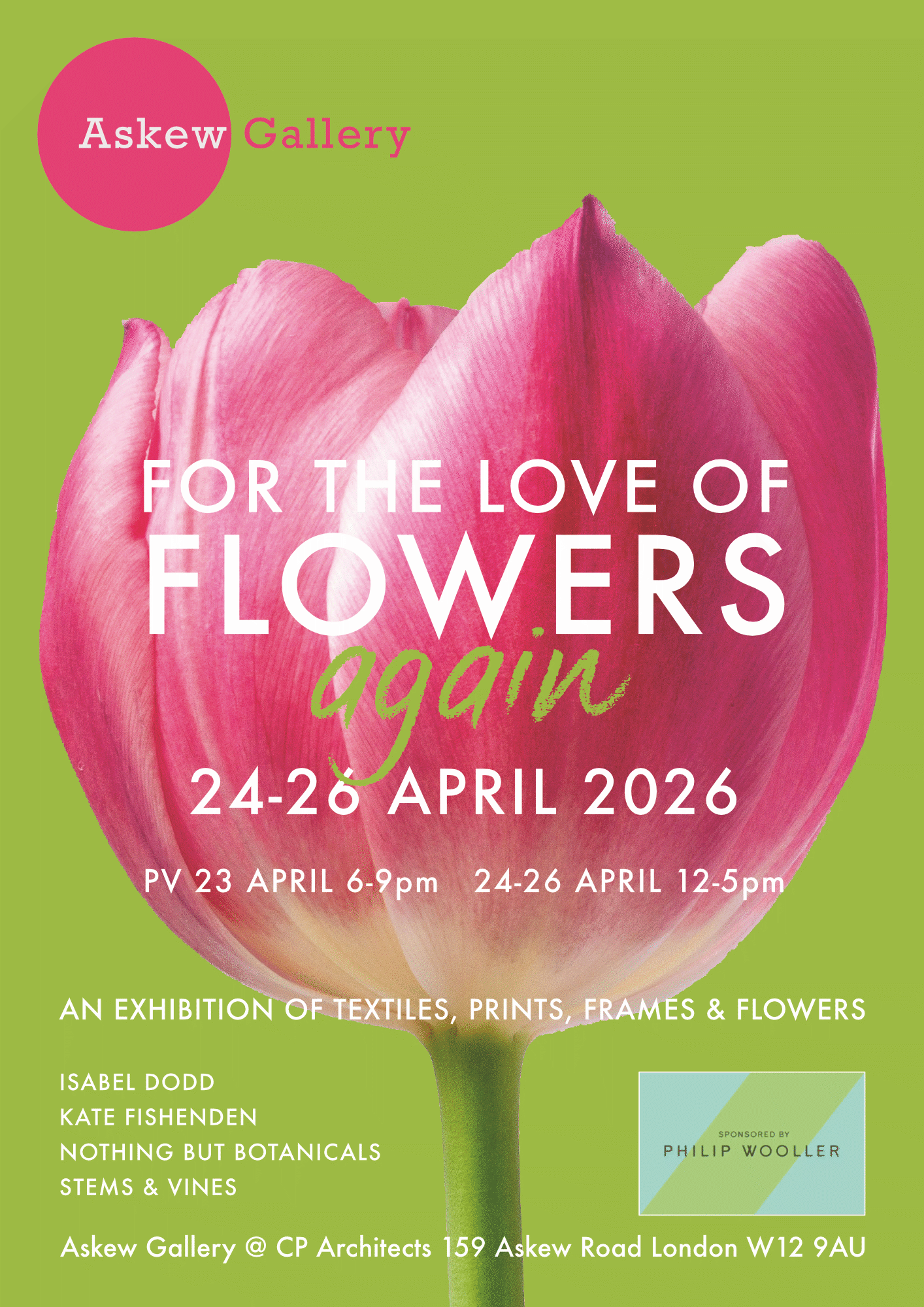Once again we delighted to announce are working with our amazing event sponsor Philip Wooller, who supported our last ‘Flowers‘ exhibition and who does so much to support events on Askew Road.